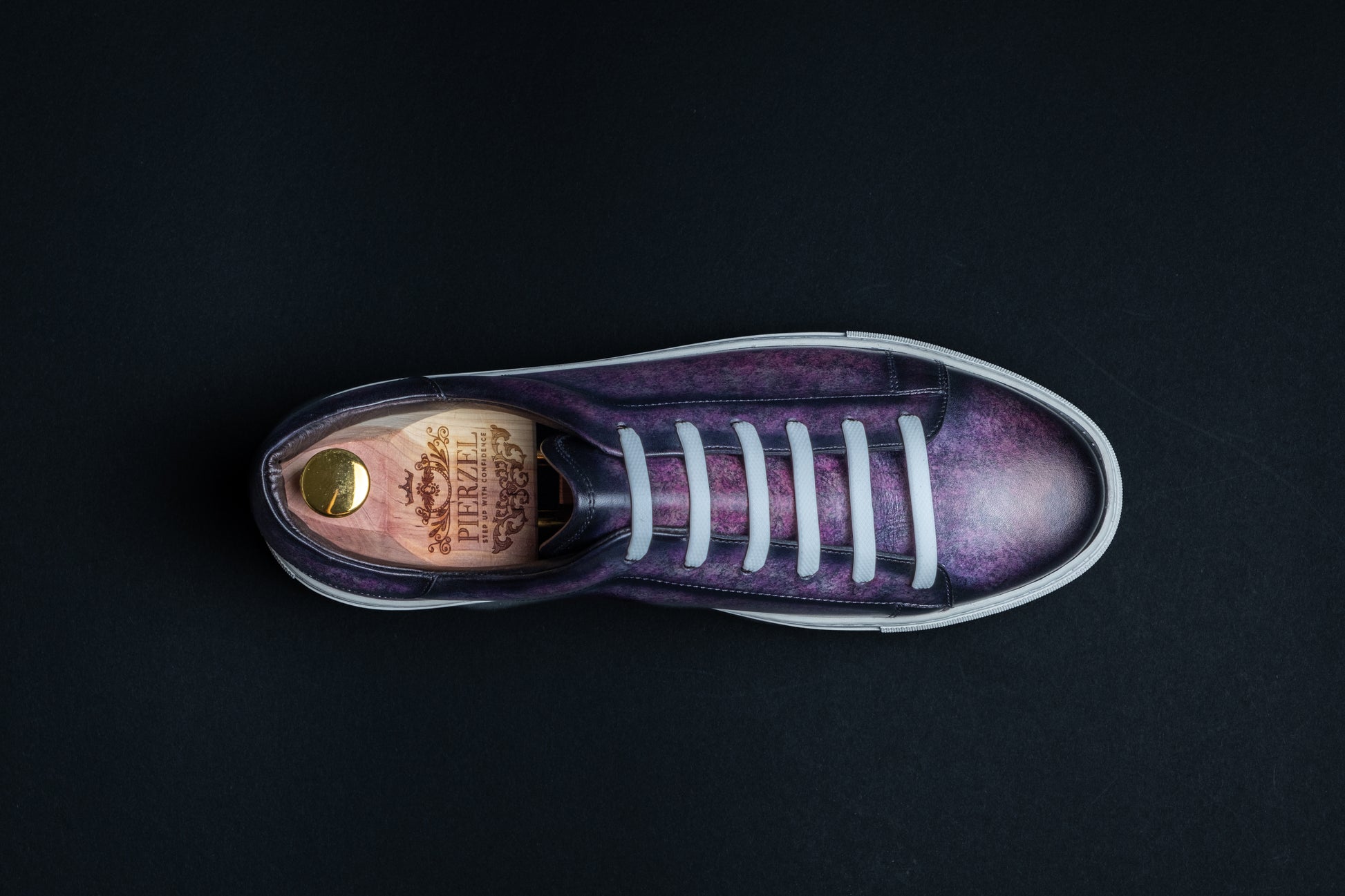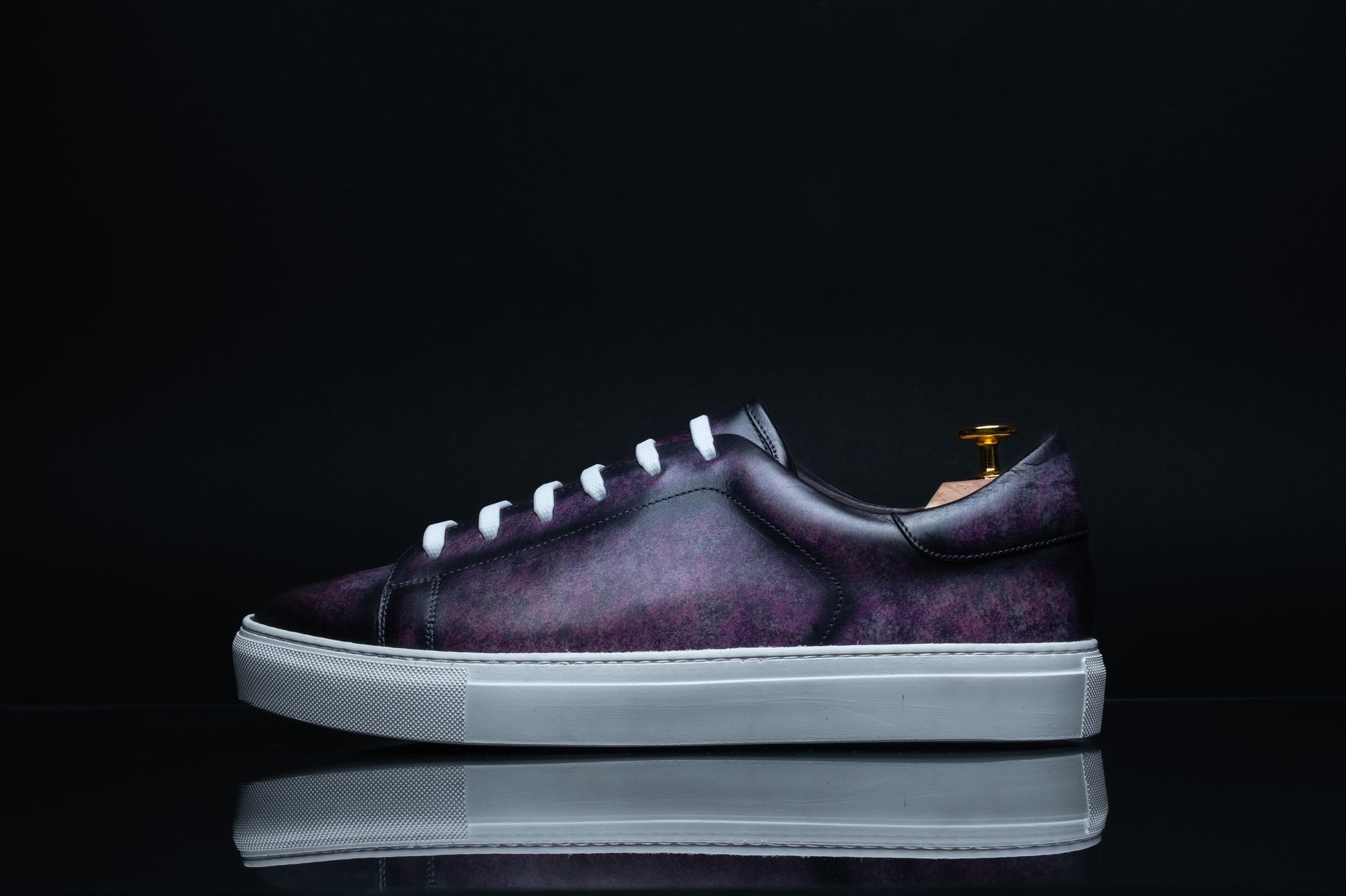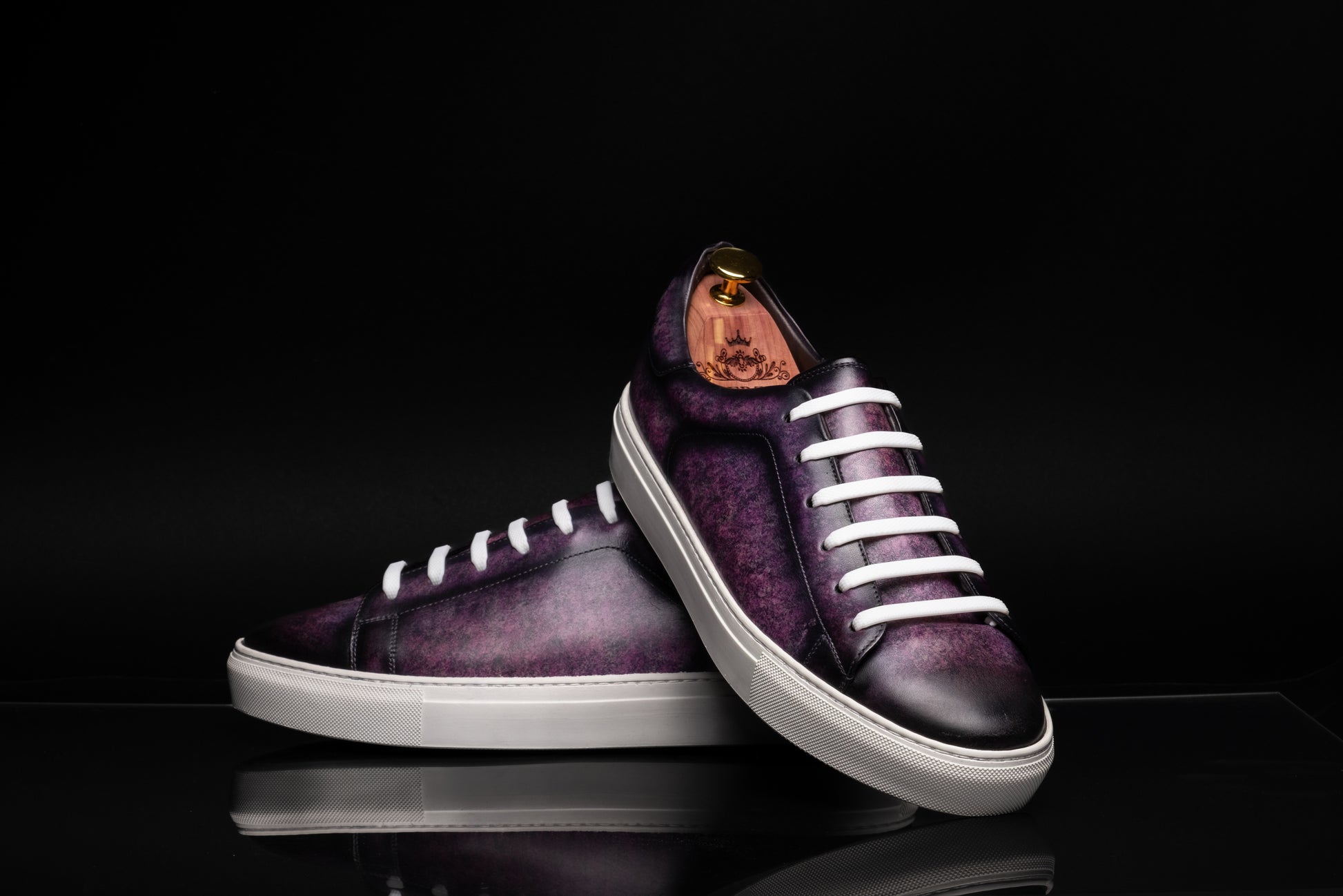 Trainers represent the ideal sneakers for men seeking a blend of style and comfort. Featuring a straightforward silhouette and adaptable design, these shoes effortlessly complement jeans or other casual outfits, creating a relaxed yet fashionable appearance. The Cordero Purple style is a trainer shoes that are meticulously hand painted using our unique marble patina technique, showcasing various tones of purple colour.