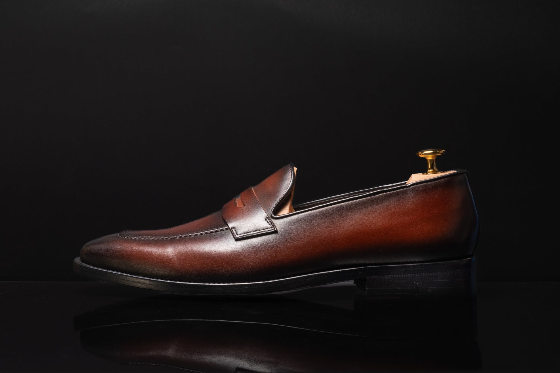 The Men’s Penny Loafer is a timeless footwear classic that seamlessly blends style and comfort. Designed without laces for easy wear, these versatile shoes are perfect for both casual weekend outings and polished office ensembles. These luxe calf medium brown penny loafers feature a beautifully hand-painted finish in a solid, rich brown hue. Enhanced with a meticulous burnishing effect, the darker accents along the edges and toe add depth and dimension to the design.