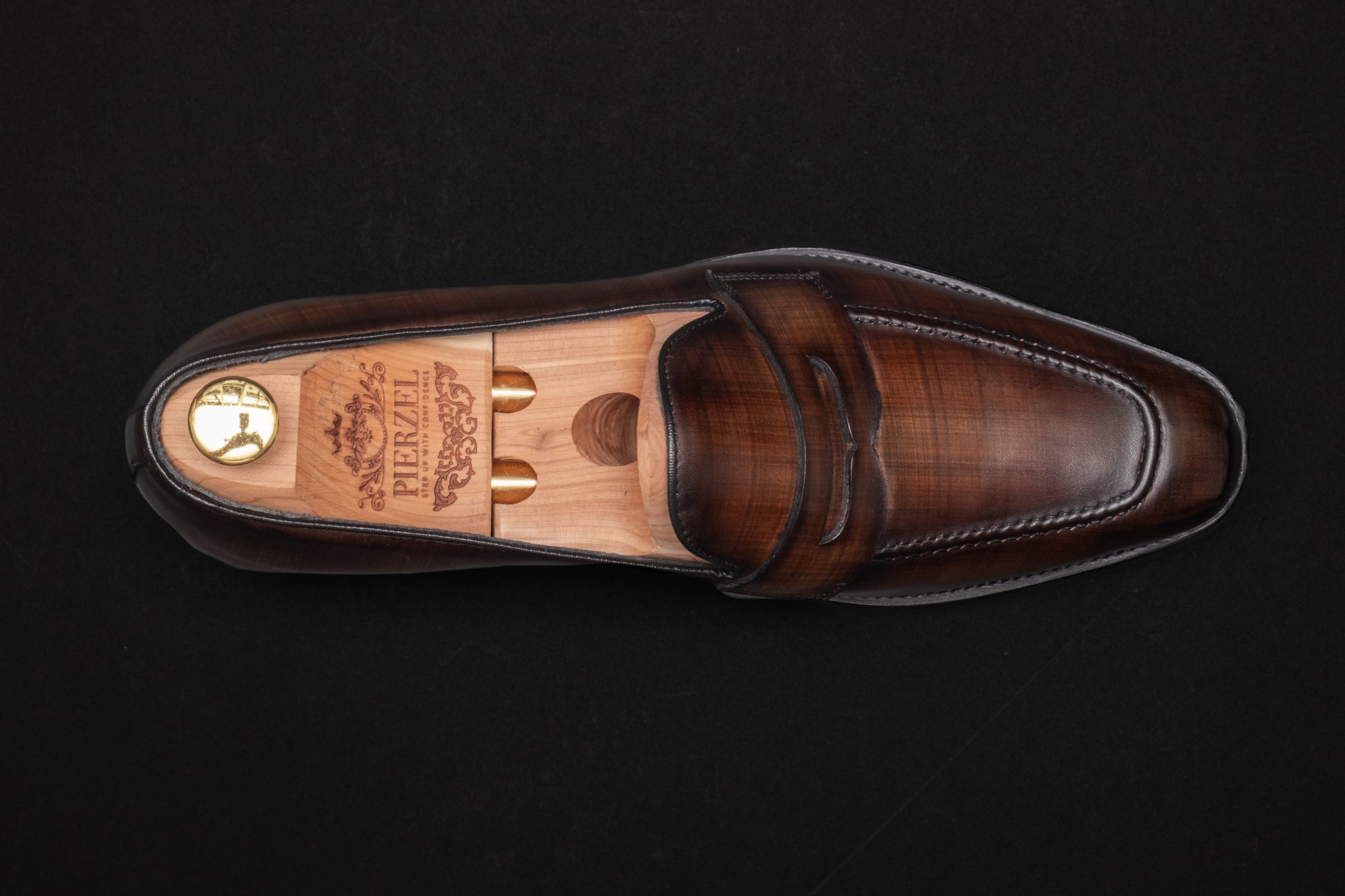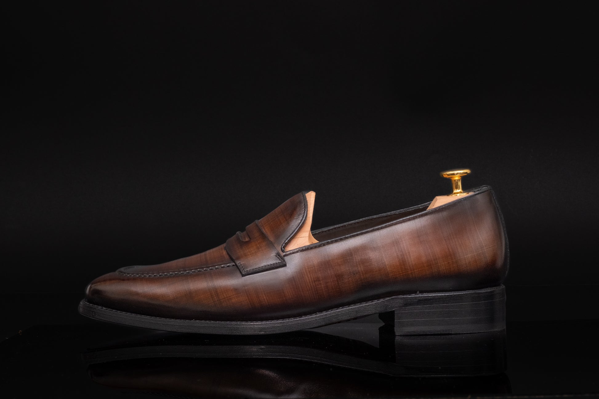 The Men’s Penny Loafer is a timeless footwear classic that seamlessly blends style and comfort. Designed without laces for easy wear, these versatile shoes are perfect for both casual weekend outings and polished office ensembles. The Dwayne Brown style features hand-painted Loafer shoes in rich, varied tones of brown, enhanced by a striking mesh-like pattern created through meticulous brushing in perpendicular directions.