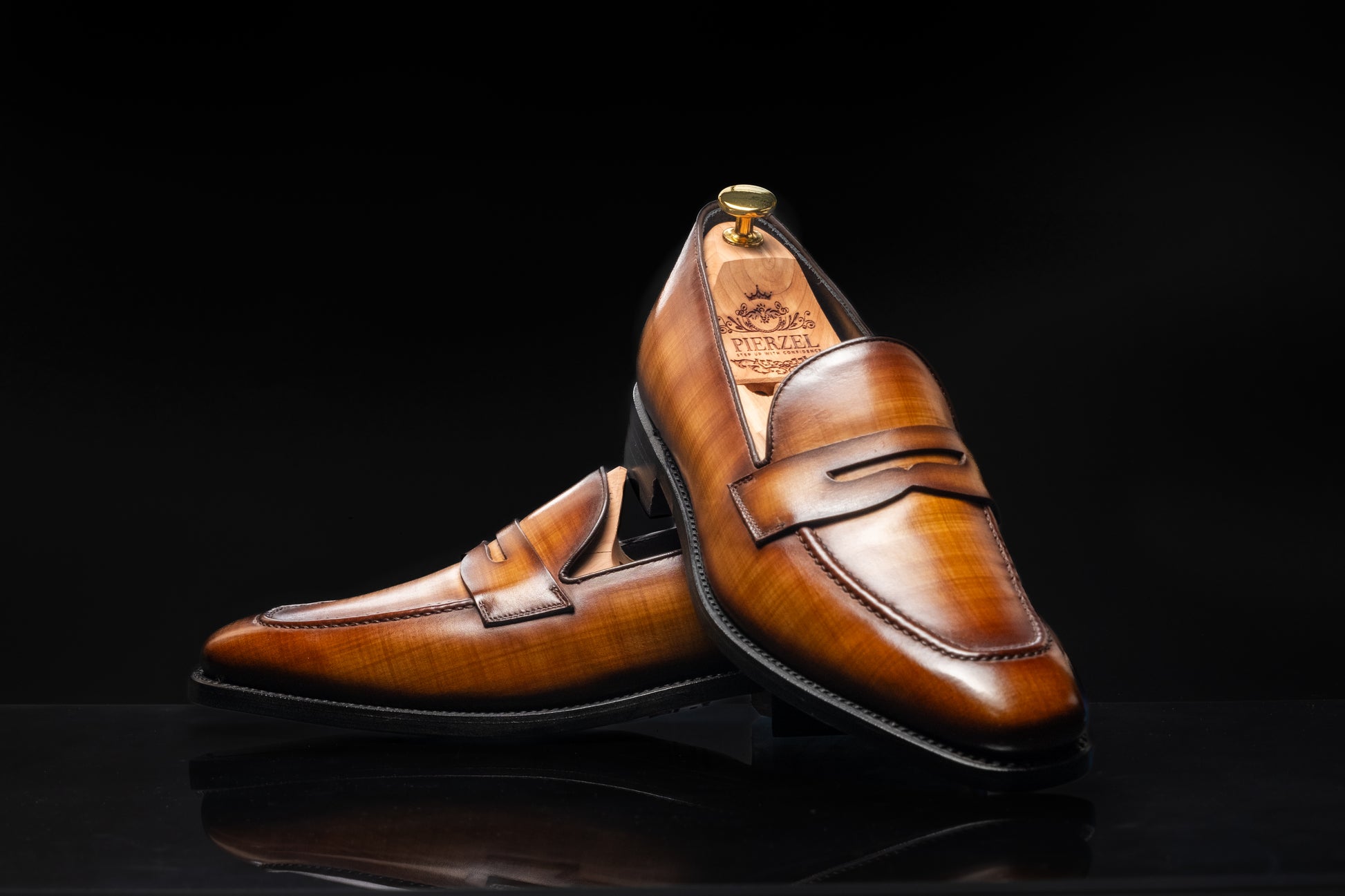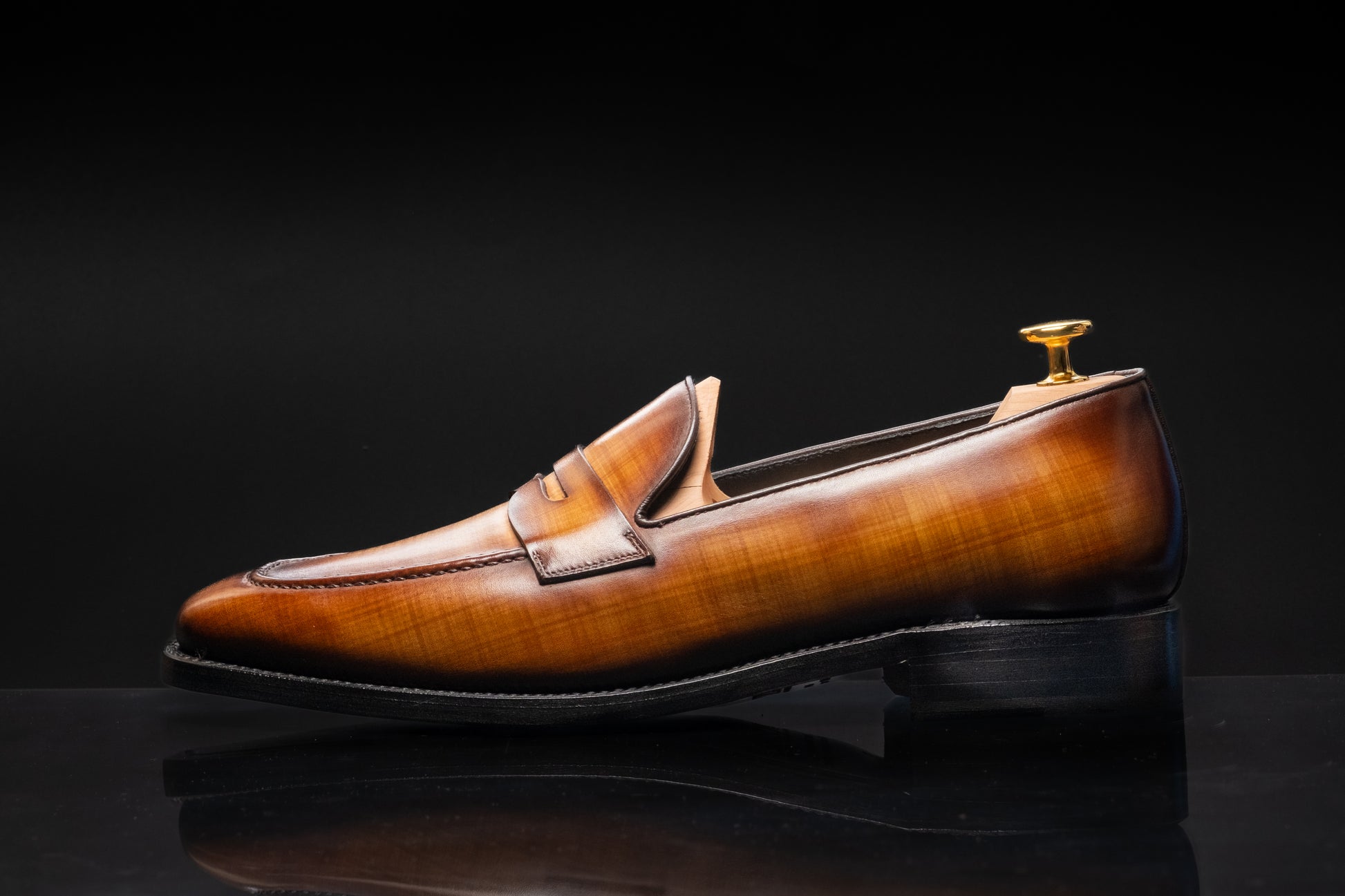 The Men’s Penny Loafer is a timeless footwear classic that seamlessly blends style and comfort. Designed without laces for easy wear, these versatile shoes are perfect for both casual weekend outings and polished office ensembles. The Dwayne Cognac style features hand-painted Loafer shoes in rich, varied tones of light brown colour, enhanced by a striking mesh-like pattern created through meticulous brushing in perpendicular directions.