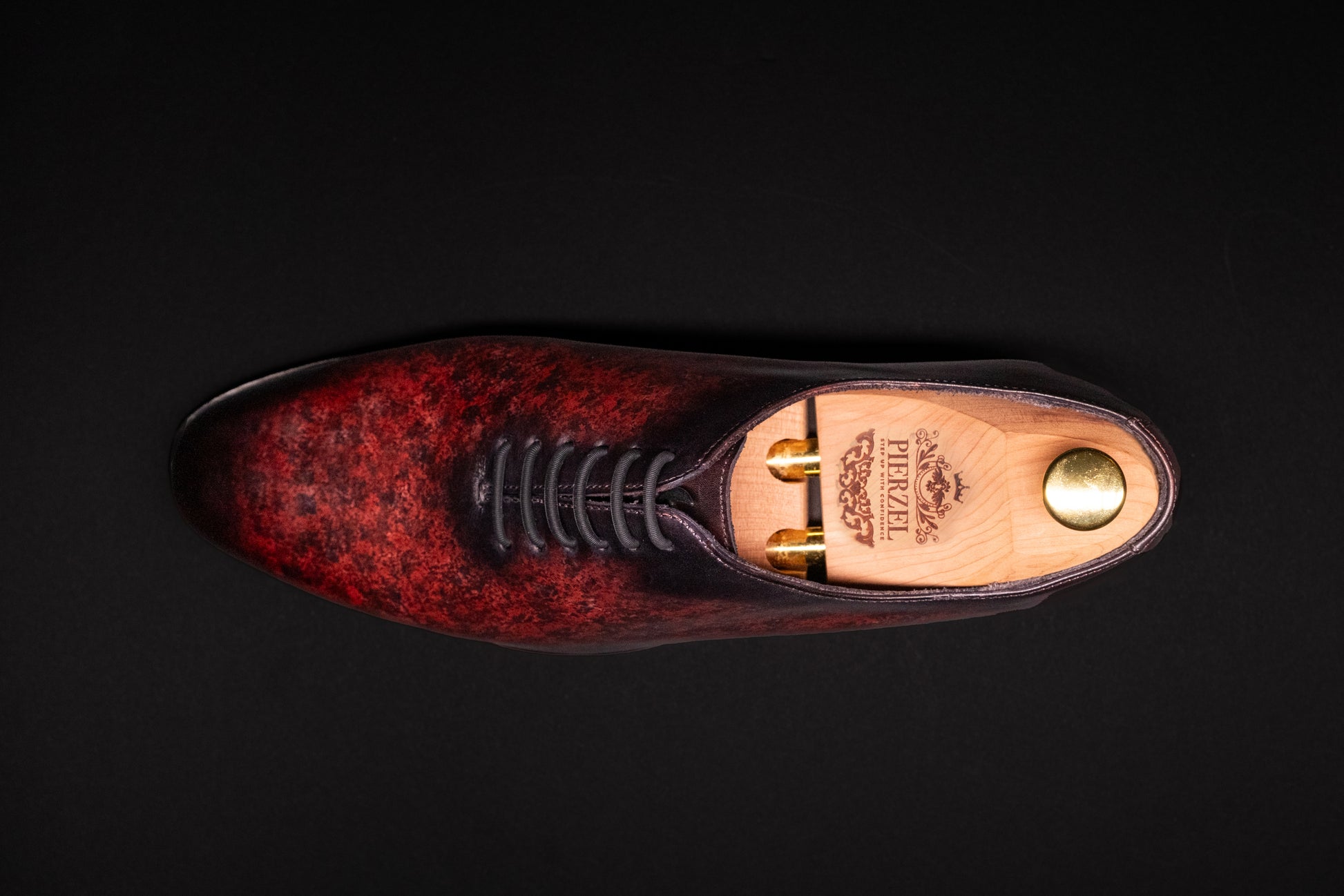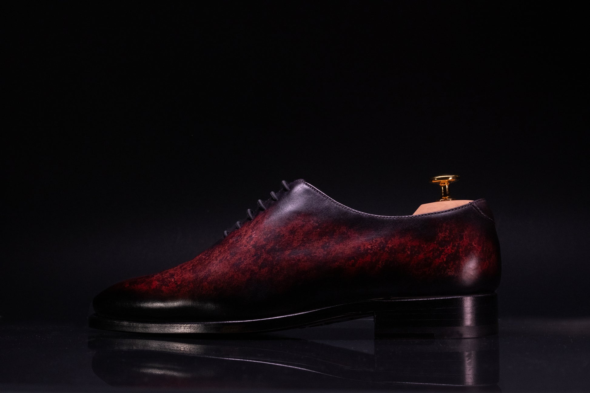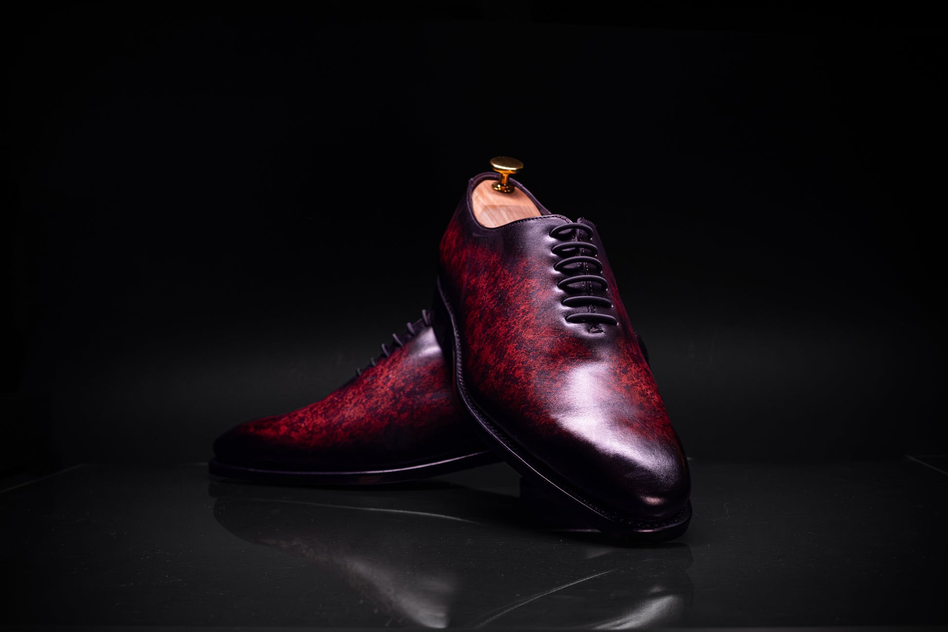 The Martinez Wine style features Wholecut shoes that are meticulously hand painted using our unique marble patina technique, showcasing various tones of red colour.