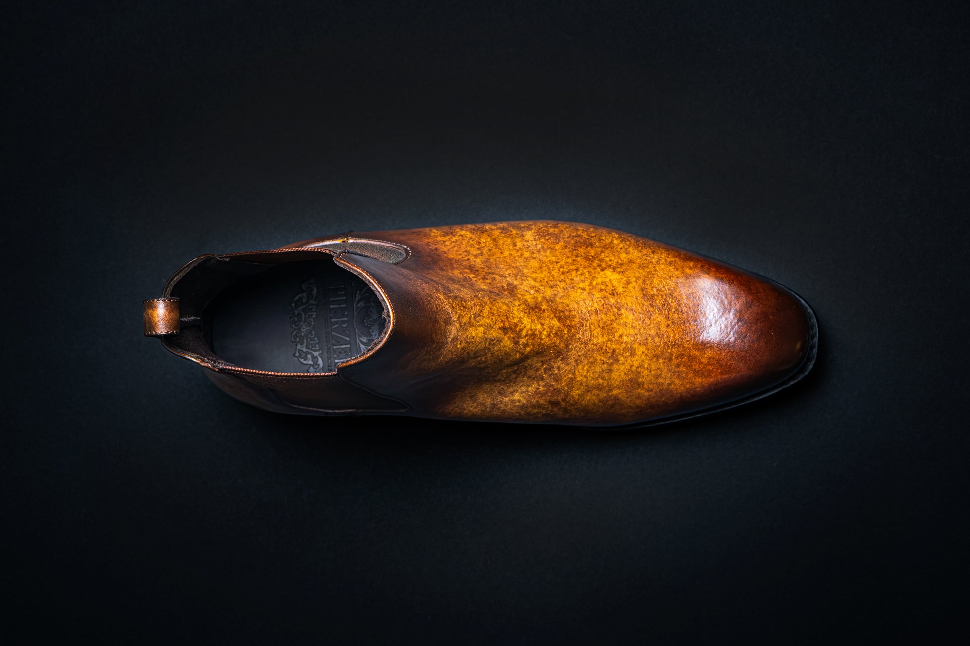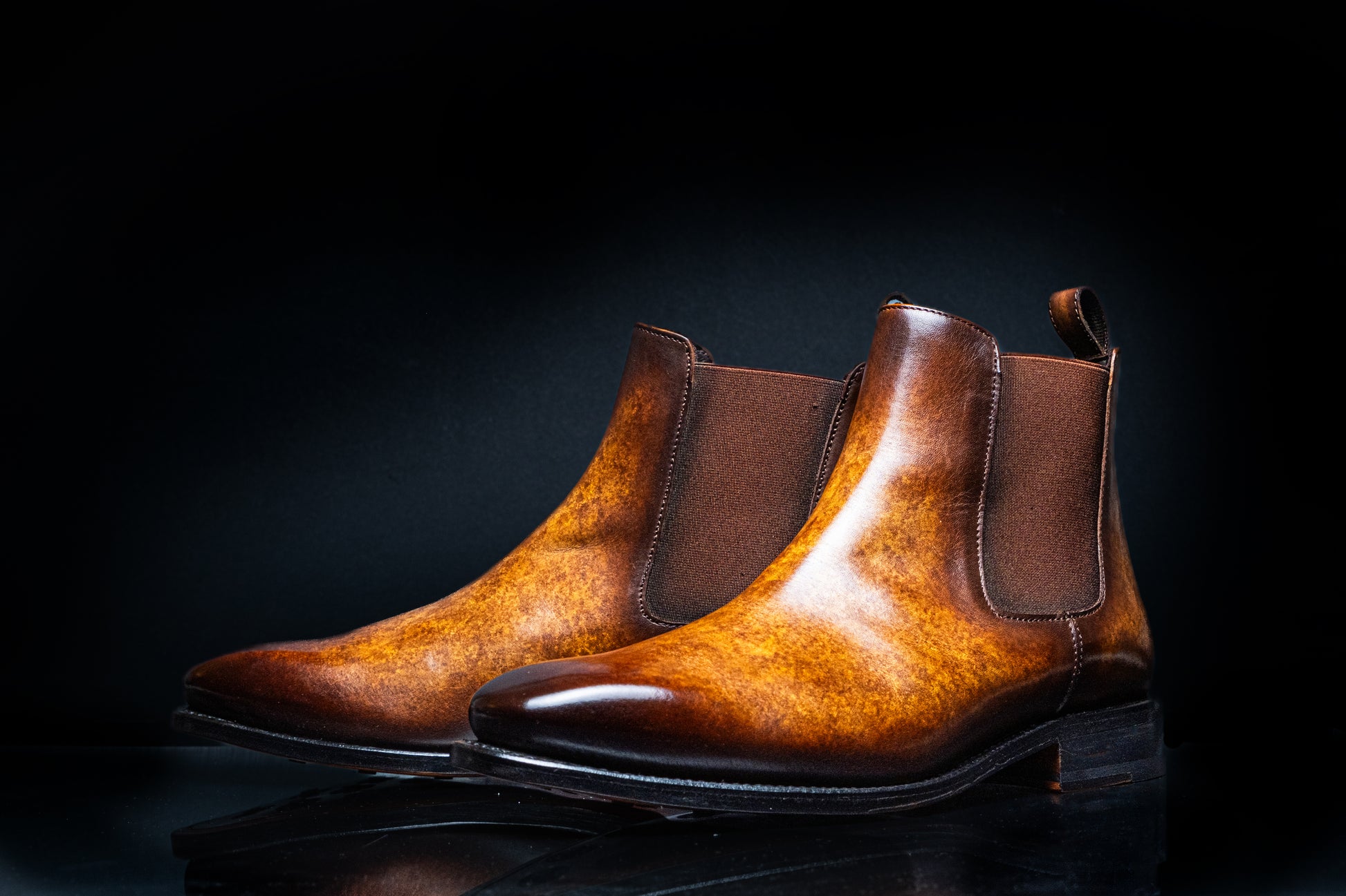 Every year, the enduring popularity of men’s Chelsea boots continues to thrive. These handcrafted Chelsea boots effortlessly blend into both formal attire and casual outfits, delivering a refined and polished appearance. As a slip-on boot, it has maintained its status as a timeless classic throughout the years. The Shiraz Cognac style features Chelsea boots that are meticulously hand painted using our unique marble patina technique, showcasing various tones of light brown colour.