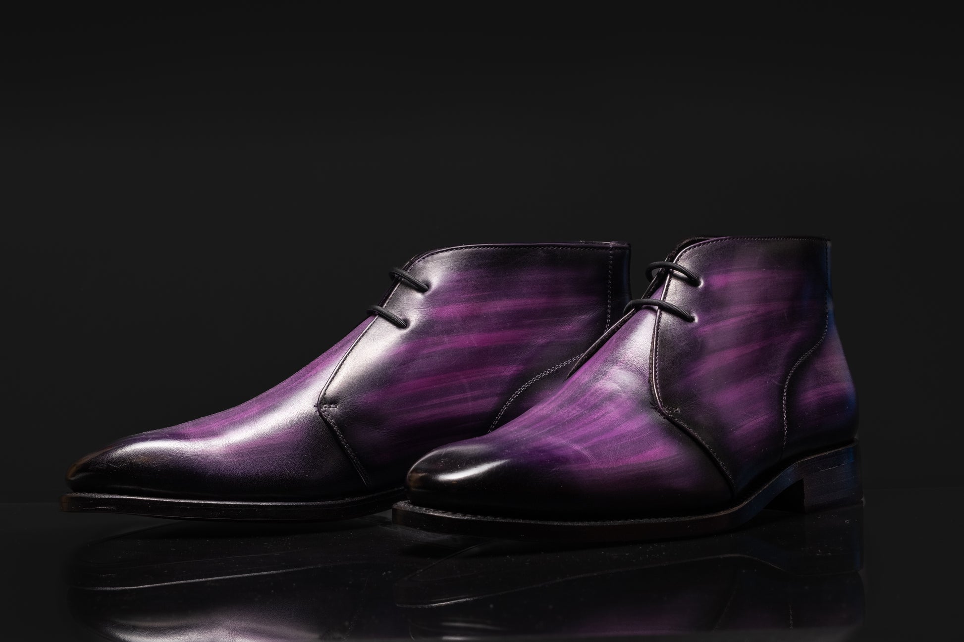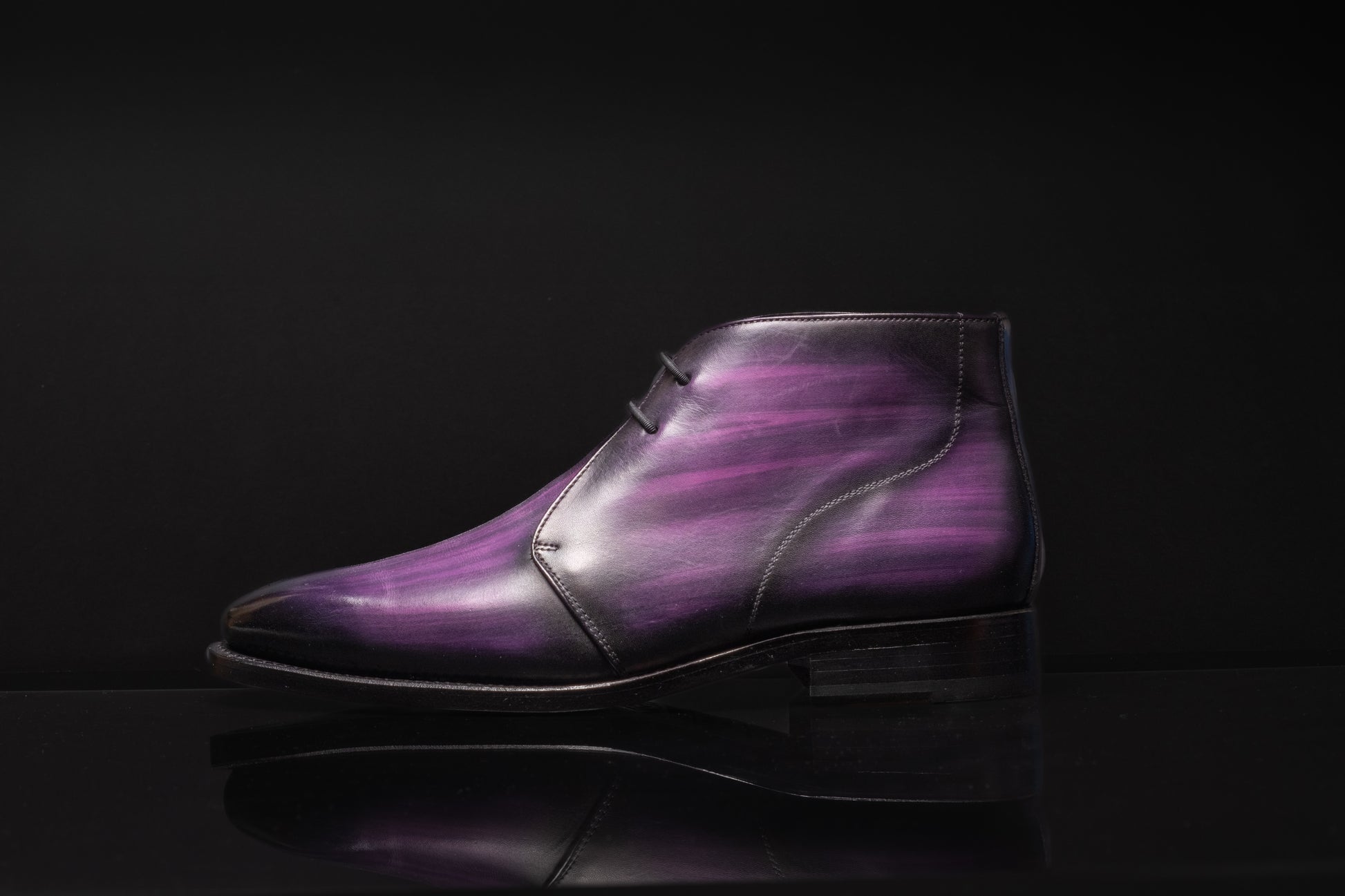 Every year, the timeless appeal of men’s chukka boots remains strong. These handcrafted boots, now enhanced with silicone elastic laces, offer a perfect balance of style and convenience. The silicone laces provide a secure fit without the hassle of traditional lacing, while the versatile chukka design effortlessly transitions from casual to semi-formal settings. Whether paired with jeans or chinos, these boots offer a refined yet relaxed appearance, making them a must-have addition to any wardrobe. With their effortless blend of comfort and sophistication, chukka boots continue to stand the test of time. The Valor Purple style showcases hand-painted Chukka Boots adorned with various tones of purple colour