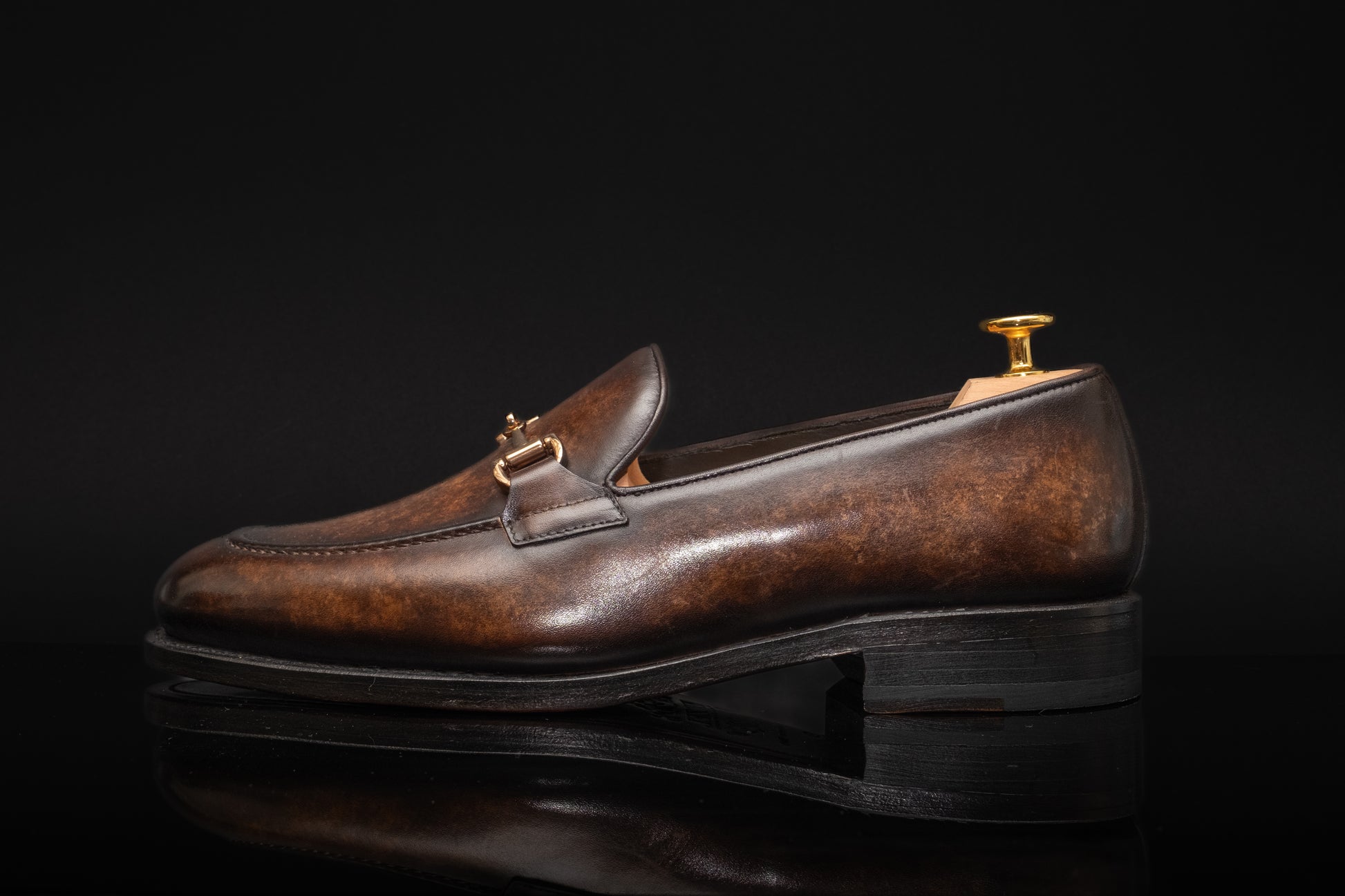 The Metal Bit Loafer exudes modern sophistication with a touch of refined elegance. Featuring a distinctive metal bit across the vamp, these loafers combine classic loafer design with a bold, contemporary accent. Crafted with attention to detail, they offer both comfort and style, making them a versatile choice for both formal and casual outfits. The Vanderbilt Brown style features Metal Bit Loafers that are meticulously hand painted using our unique marble patina technique, showcasing various tones of brown colour.